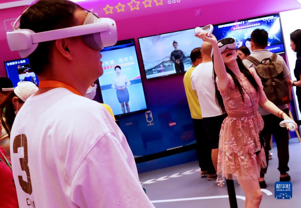 6月28日,參觀者在峰會展示區內體驗VR體感游戲。