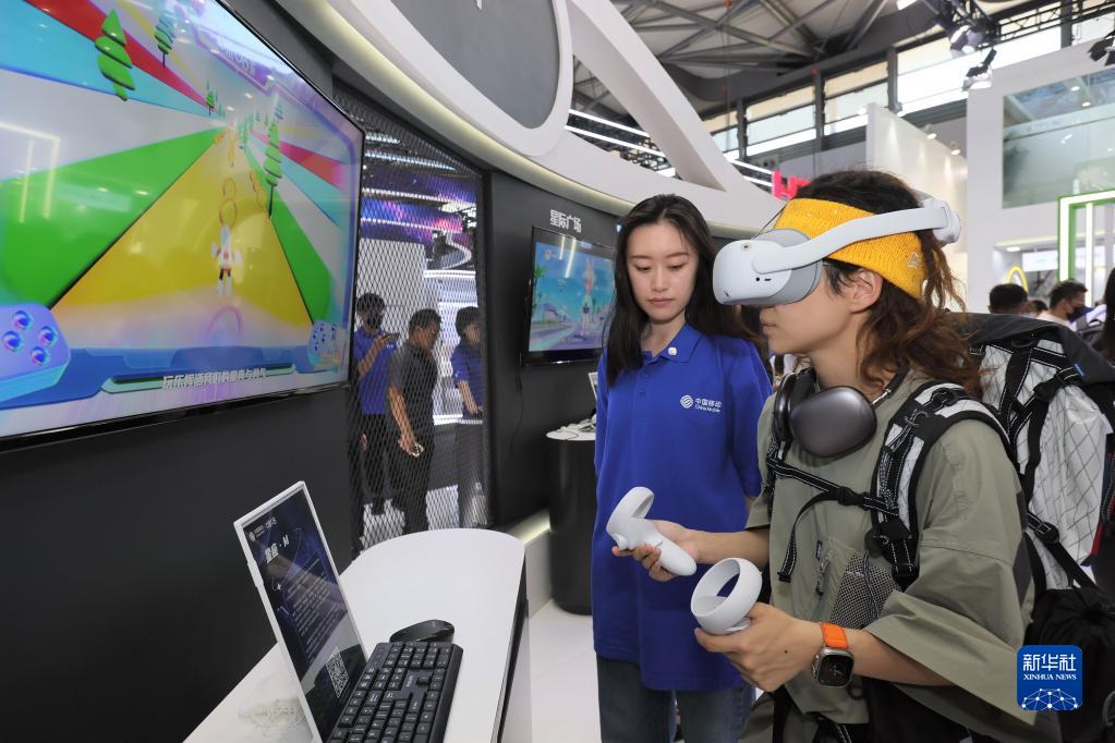 6月28日,人們在中國移動展臺佩戴VR智能眼鏡進行體驗。