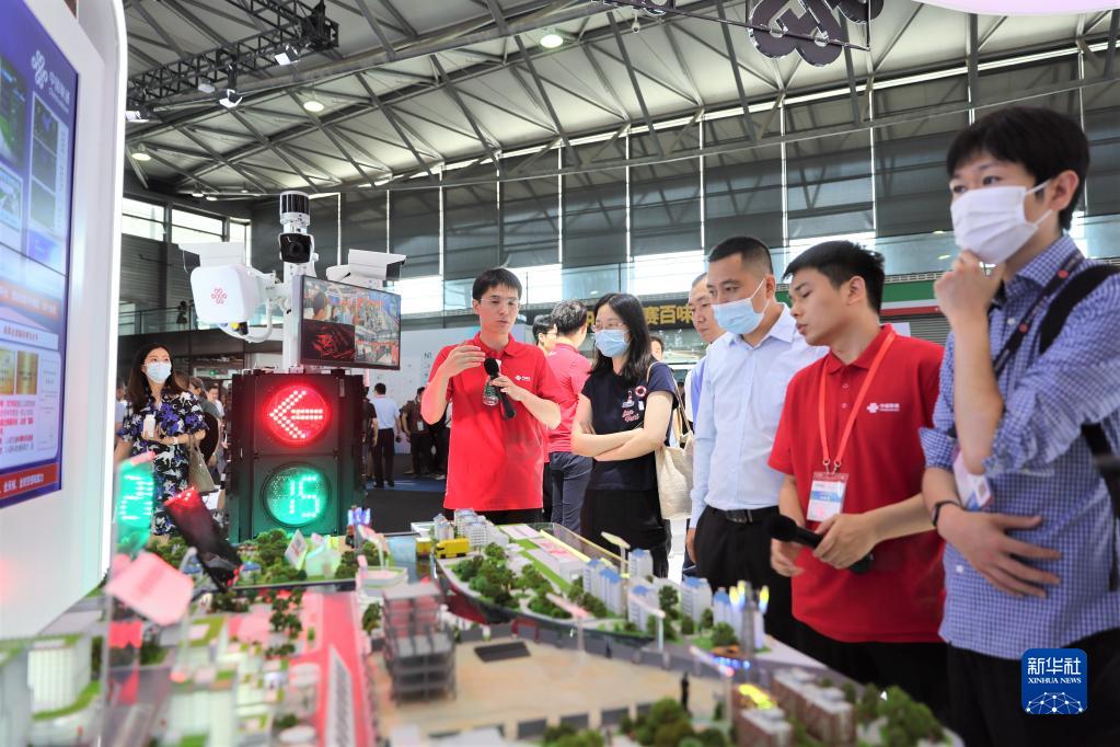 6月28日,工作人員在中國聯通展臺為參觀者介紹5G通信感知智能系統。
