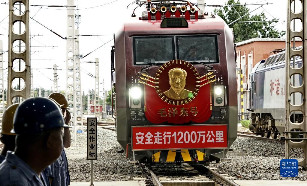 當日,中國鐵路北京局集團豐臺機務段舉行“毛澤東號”機車實現安全走行1200萬公里迎接儀式和表彰儀式?!懊珴蓶|號”機車目前擔當北京至長沙的Z1/2次旅客列車牽引任務。新華社記者 李欣 攝