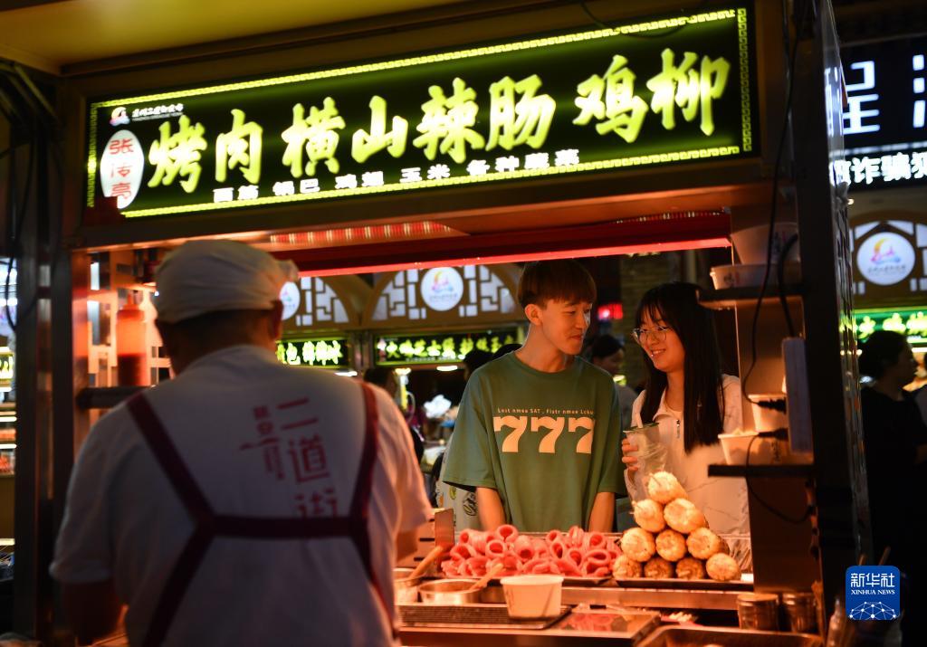 6月28日,游客在延安市延州二道街夜市購買小吃。