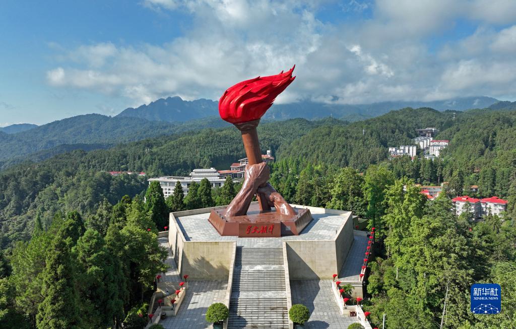 6月28日拍攝的井岡山“星火相傳”雕塑(無人機照片)。