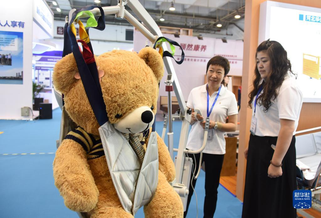 6月29日,一家參展企業工作人員在展會上展示一款護理電動移位器。