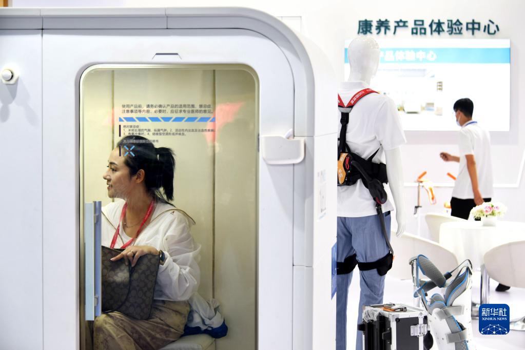 6月29日,一名參觀者在展會上體驗微高壓氧艙。