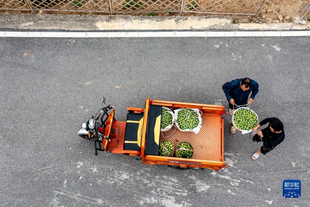 6月28日,在重慶市巫山縣曲尺鄉柑園村,村民將采摘的巫山脆李裝車(無人機照片)。