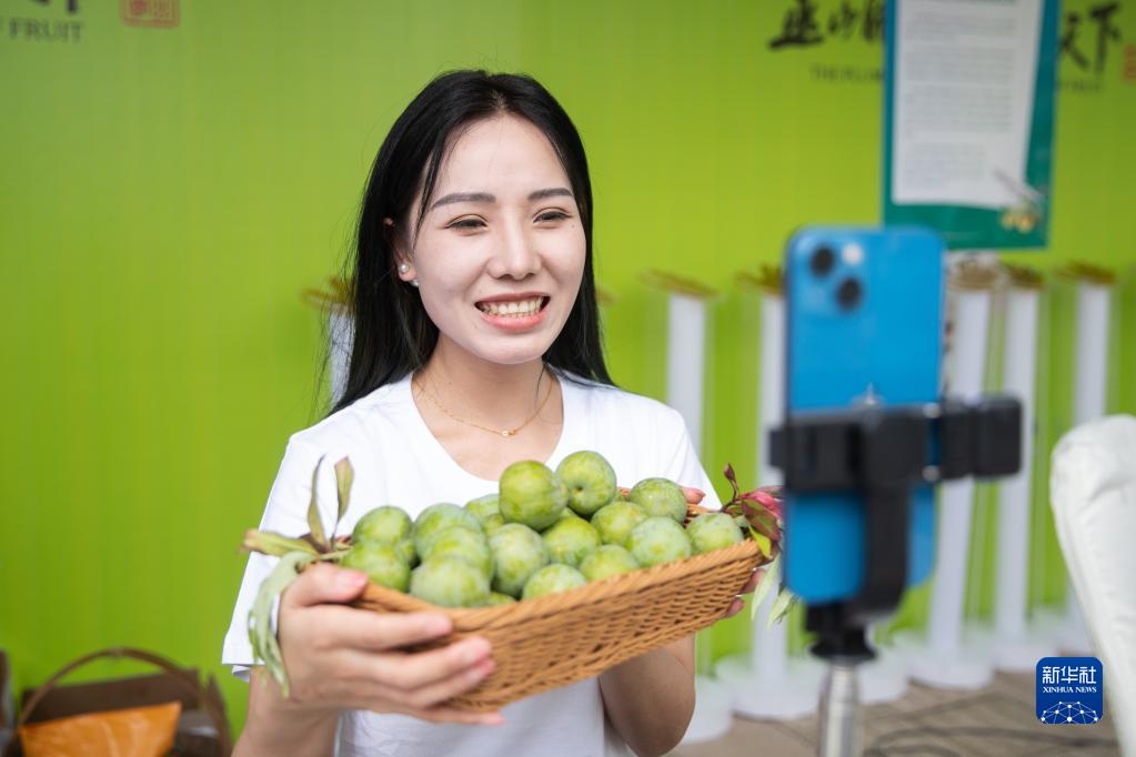 6月28日,在巫山脆李第七屆開園節暨中國郵政航空“脆李航班”啟航儀式活動現場,一名主播在直播售賣巫山脆李。