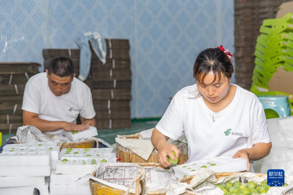 6月28日,在重慶市巫山縣曲尺鄉柑園村的脆李分揀中心,郵政工作人員在打包巫山脆李。