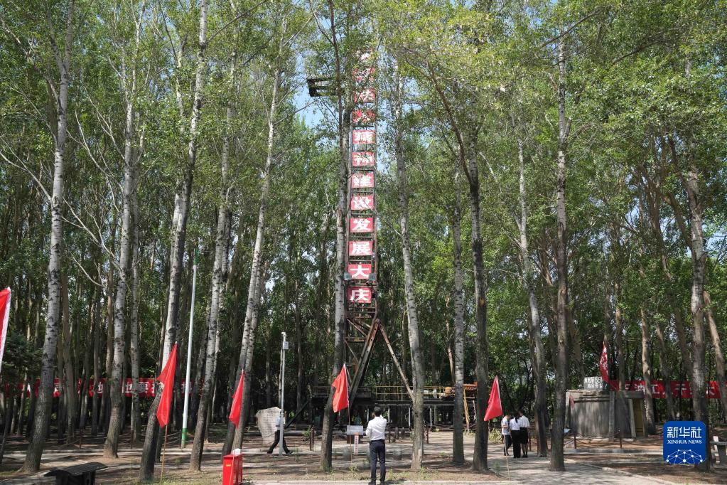6月28日,參觀者在大慶油田鐵人一口井教育培訓基地觀看鉆井架。
