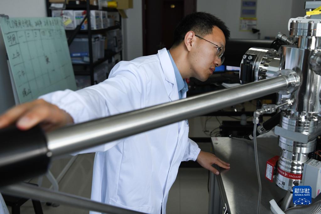 6月28日,在中科院合肥物質科學研究院強磁場科學中心實驗室,郝林向脈沖激光分子束外延系統中傳送樣品。