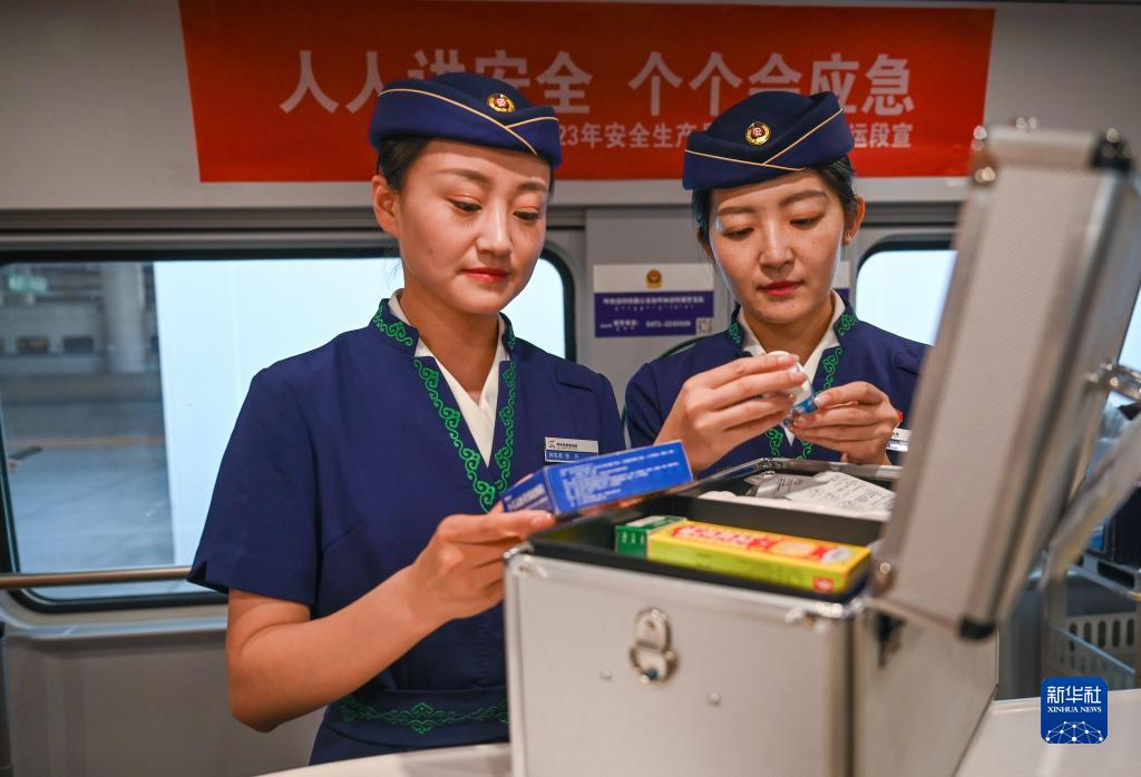 6月29日,呼和浩特客運段西寧車隊動車組乘務員在列車上檢查藥品箱。