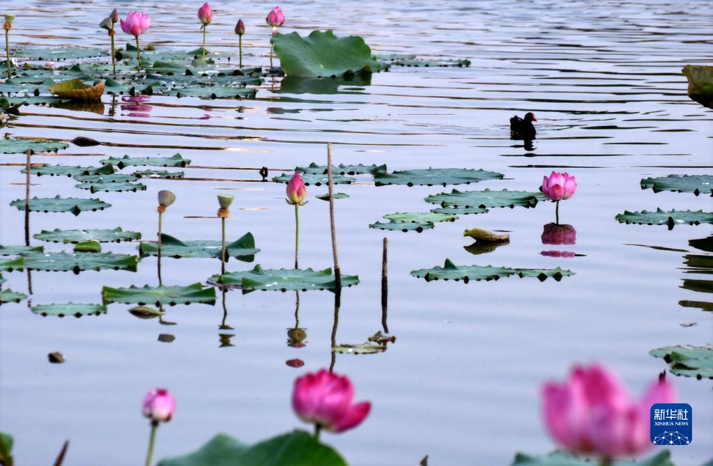 6月26日,水鳥在山東省淄博市沂源縣一公園荷塘里戲水。