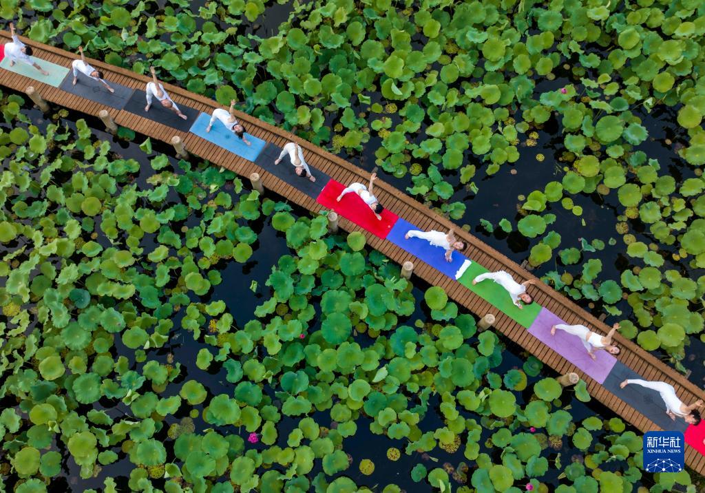 6月21日,瑜伽愛好者在江蘇泰州天德湖公園荷花池棧橋上練瑜伽(無人機照片)。