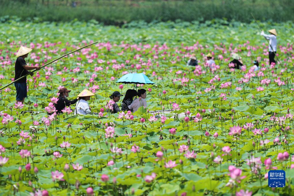 6月21日,在河南省商丘市梁園區黃河故道田八莊荷塘,游客坐船賞花游玩。