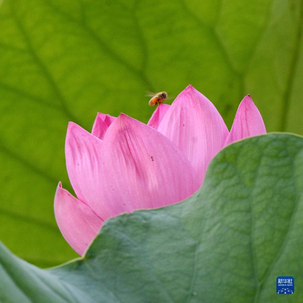 6月21日,在河北省石家莊市欒城區人民公園荷塘,一只蜜蜂落在盛開的荷花上。