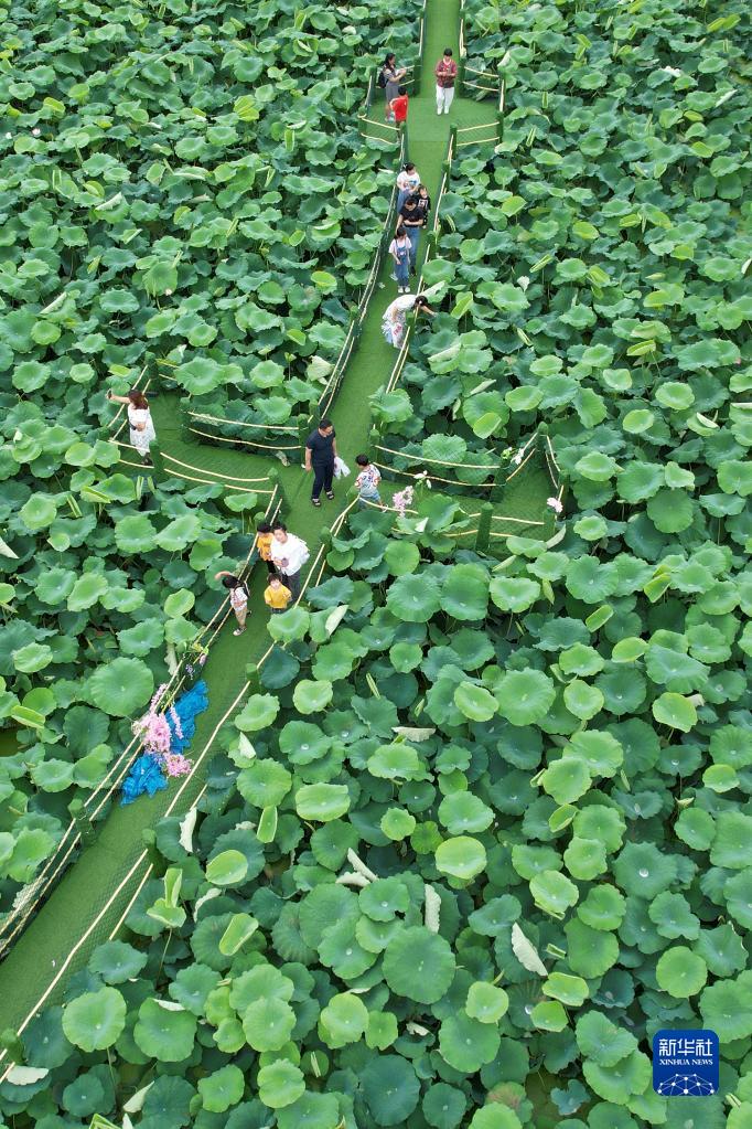 6月23日,在湖南省湘西土家族苗族自治州吉首市,游人在乾州古城胡家塘賞荷休閑(無人機照片)。