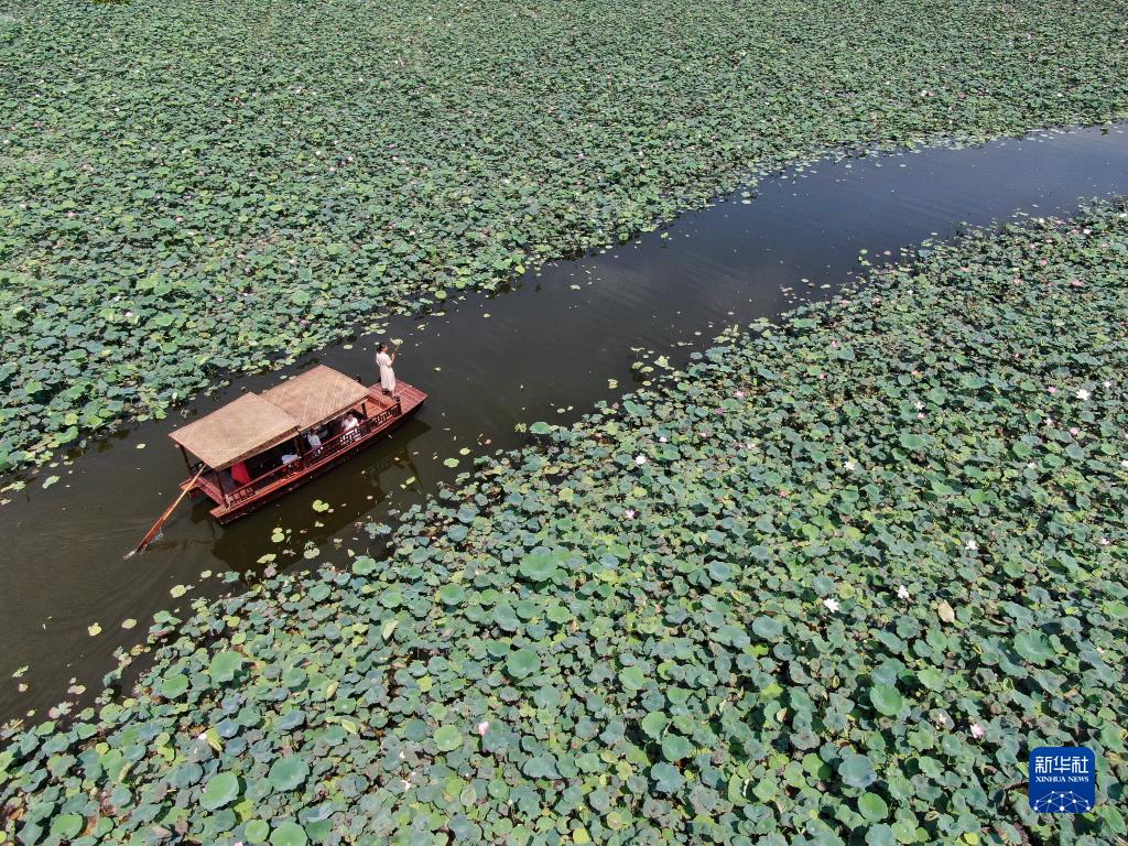 6月18日,游客在云南省景洪市勐罕鎮一處荷塘內乘船賞荷(無人機照片)。