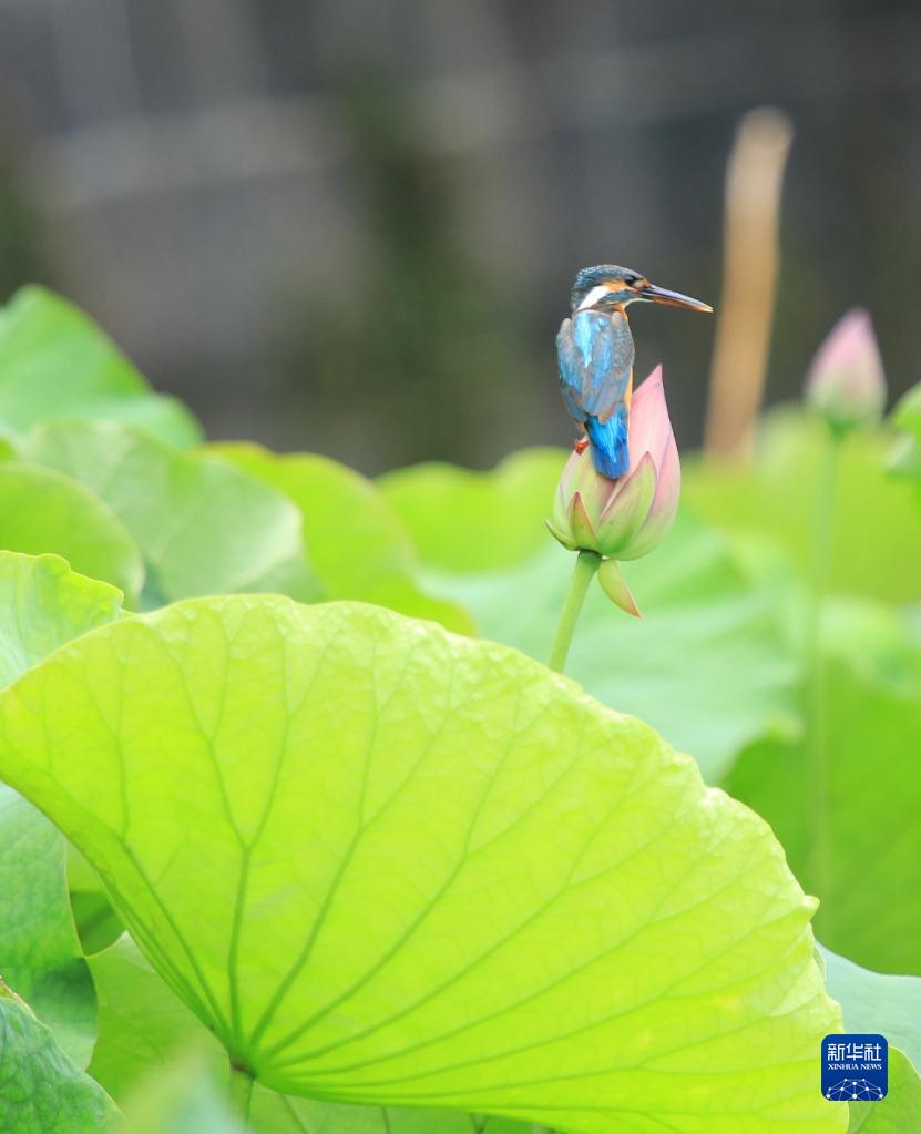 6月13日,在云南省騰沖市荷花鎮雨傘村荷花池,一只翠鳥立在荷花上。