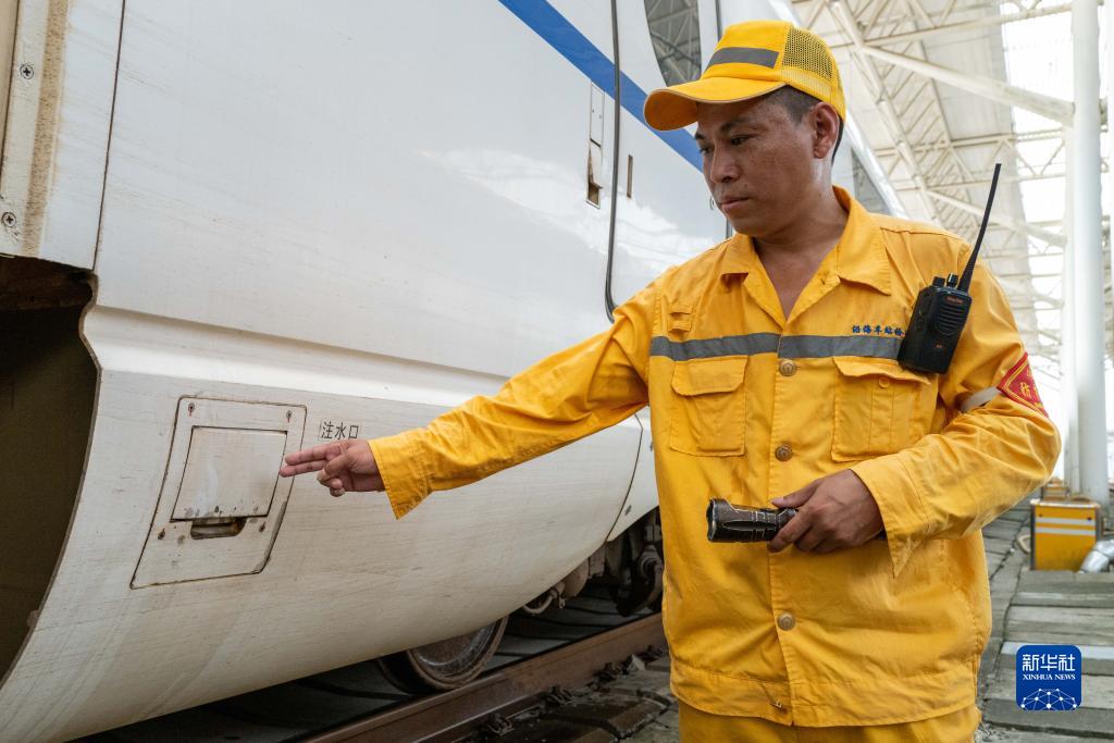 6月29日,溫州保潔工區的工人確認高鐵列車注水口已關閉。