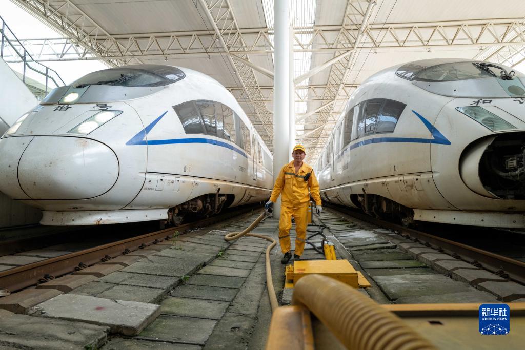 6月29日,溫州保潔工區的工人對??繙刂菽险镜母哞F列車進行上水卸污作業。
