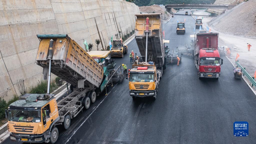 6月29日,中鐵十二局工人在貴金古高速公路清池至古藺段進行路面施工(無人機照片)。