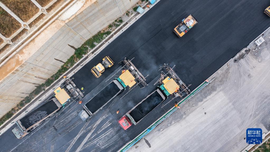 6月29日,中鐵十二局工人在貴金古高速公路清池至古藺段進行路面施工(無人機照片)。