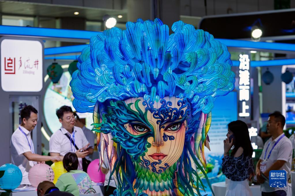6月29日在第十九屆中國西部國際博覽會的成渝地區雙城經濟圈建設館的自貢展區拍攝的精衛女神彩燈。