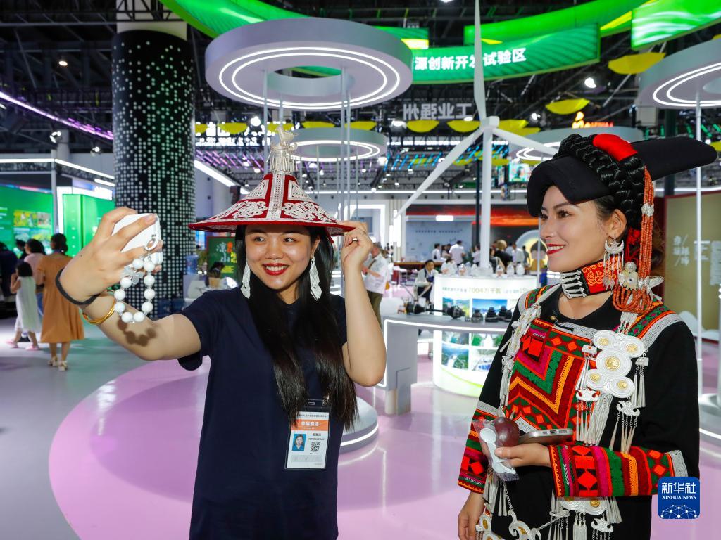 6月29日,在第十九屆中國西部國際博覽會的四川“五區共興”館內的涼山州展區,一名參展商(左)試戴彝族特色帽飾。