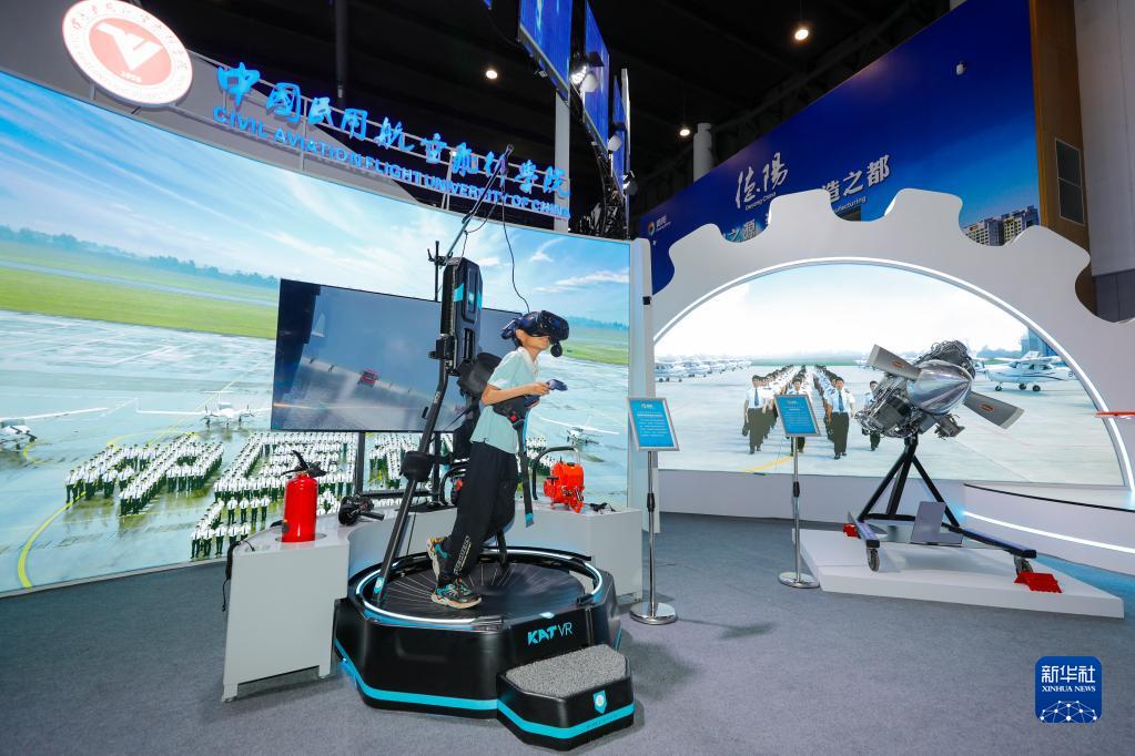 6月29日,在第十九屆中國西部國際博覽會區域合作發展館的德陽展區,一名小參觀者在中國民用航空飛行學院展區體驗VR設備。
