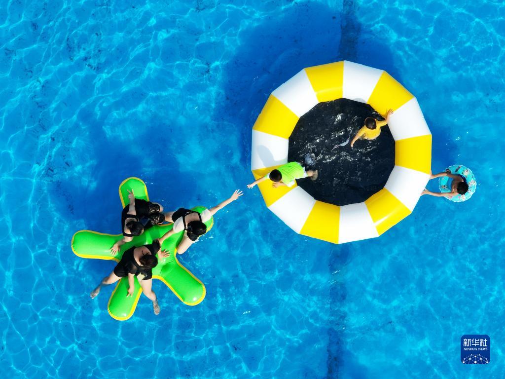 炎炎夏日,人們前往水上樂園,體驗趣味水上活動,戲水消暑,享受清涼。