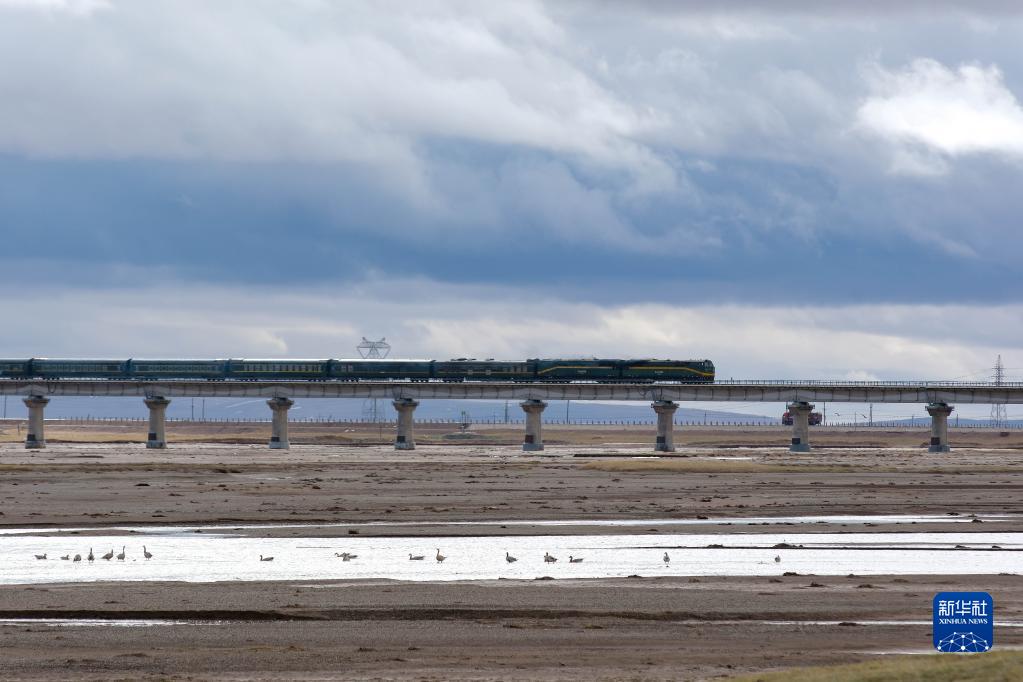 6月15日,一列火車駛過長江源地區的沱沱河。新華社記者張鋮攝