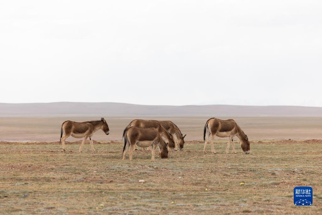 6月15日,在長江源地區的楚瑪爾河附近,幾只藏野驢在覓食。新華社記者金立旺攝
