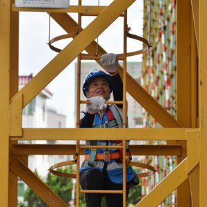 6月29日,張軍麗在項目工地攀爬塔吊。