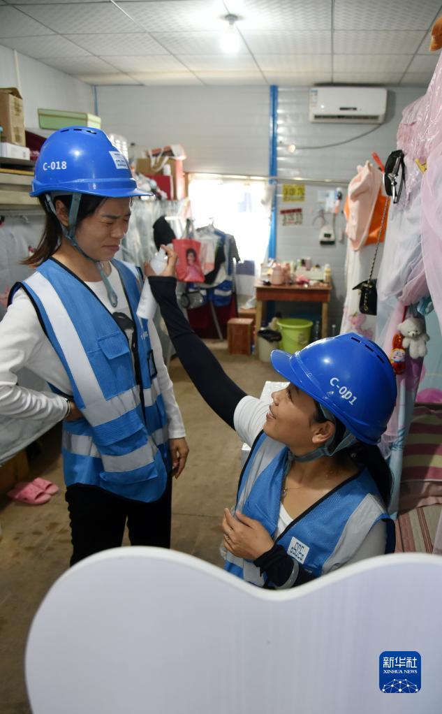 6月29日,張軍麗(右)給妹妹張坦噴防曬劑。新華社記者 周科 攝