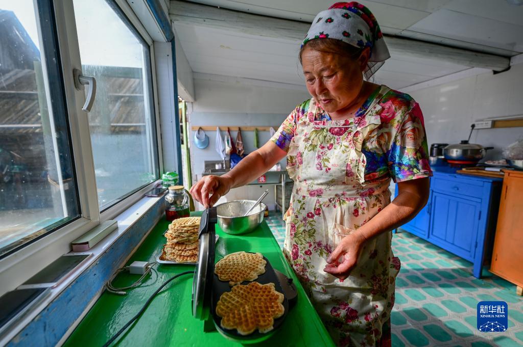 6月28日,考占花在烤制華夫餅??颊蓟ㄊ嵌砹_斯族,2004年開始經營俄羅斯族家庭游。