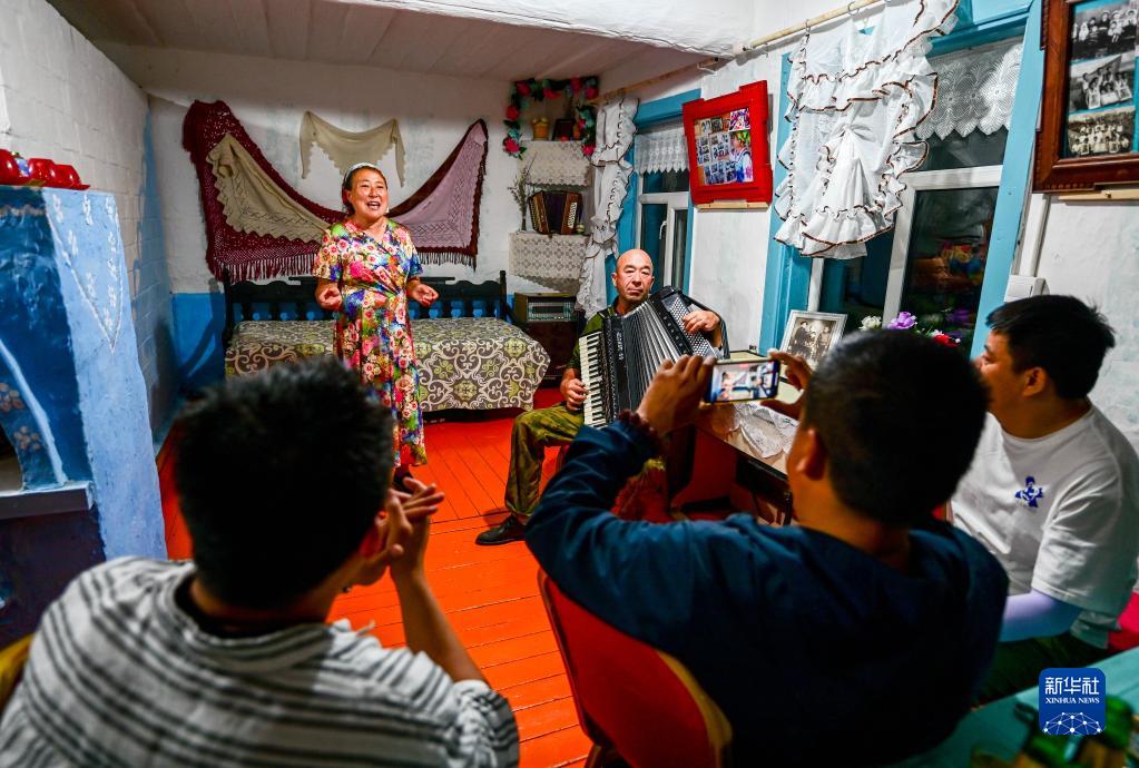 6月28日,考占花(左)為游客們唱歌,薩沙在拉手風琴??颊蓟ㄊ嵌砹_斯族,2004年開始經營俄羅斯族家庭游。