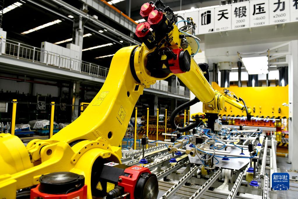 6月29日,山東省日照高新技術產業開發區日照中興汽車有限公司的工業機器人在沖壓汽車配件。
