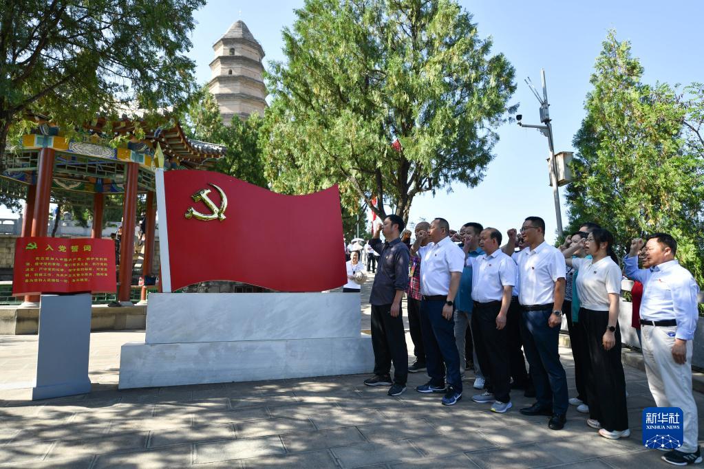 6月30日,在延安寶塔山參觀的黨員干部重溫入黨誓詞。
