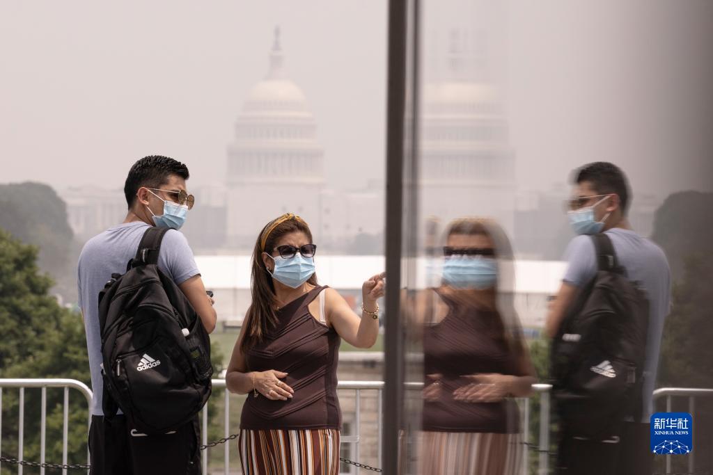 6月29日,在美國首都華盛頓,游客戴著口罩在華盛頓紀念碑游覽,遠處的國會大廈籠罩在煙霧中。