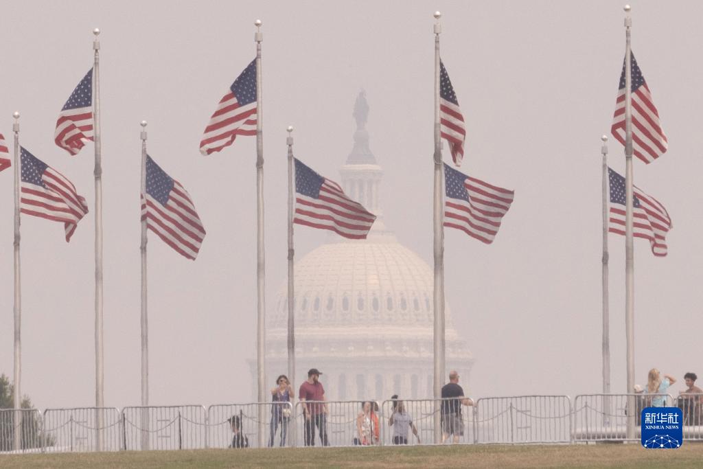 6月29日,在美國首都華盛頓,游客在華盛頓紀念碑游覽,遠處的國會大廈籠罩在煙霧中。
