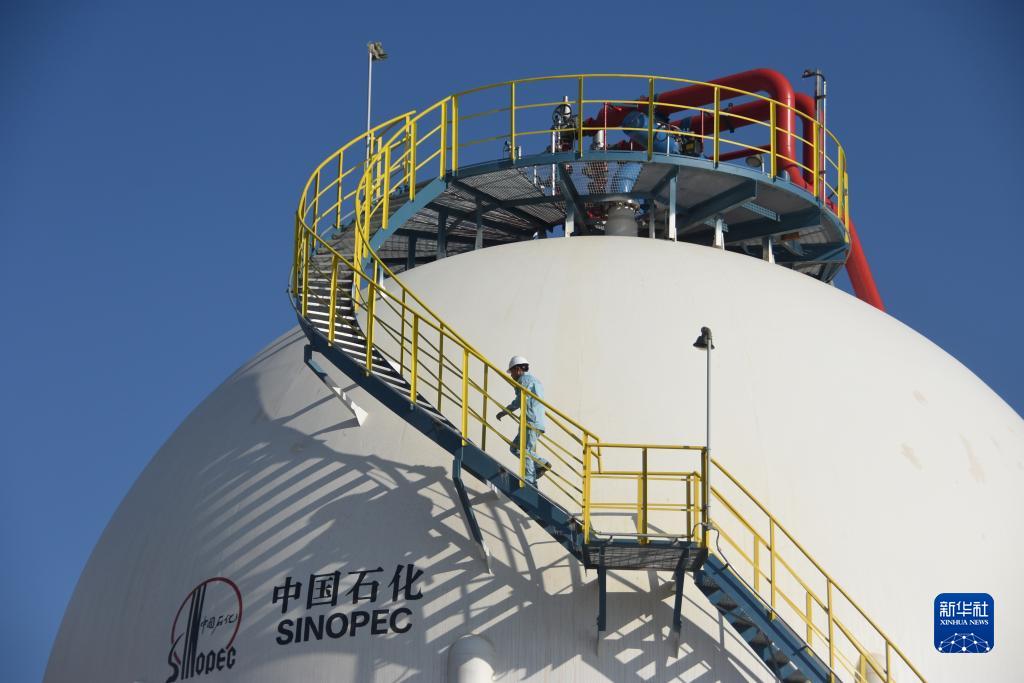 6月30日,中國石化新疆庫車綠氫示范項目的員工對儲氫罐進行巡檢。
