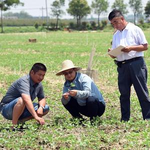 6月28日,在太和縣淙祥現代農業種植專業合作社的高產攻關示范田里,徐淙祥(右)和兒子徐?。ㄗ螅?、孫子徐旭東查看新品種大豆的出苗情況。