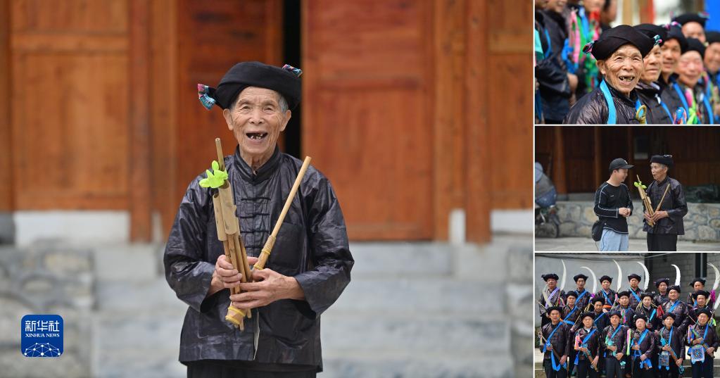 拼版照片:左圖為廣西融水苗族自治縣桿洞鄉堯告村91歲的老黨員余炳萬(2023年6月27日攝);右上圖為余炳萬在堯告村民俗文化活動中(2019年3月12日攝);右中圖為余炳萬(右)在指導后輩進行苗族非遺文化保護和發展(2023年6月27日攝);右下圖為余炳萬(前排右二)和堯告村拉鼓傳承人隊伍在一起合影(2019年3月12日攝)。