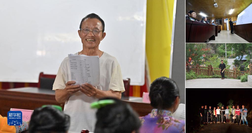 拼版照片:左圖為廣西融水苗族自治縣桿洞鄉烏英苗寨73歲的老黨員梁安合(2023年6月29日攝);右上圖為梁安合在苗寨夜校課堂上給婦女們講課(2022年4月20日攝);右中圖為梁安合在巡寨打更,提醒村民們注意用火用電安全和做好日常衛生工作(2023年6月29日攝);右下圖為梁安合(右四)和村民們在種樹后合影(2019年4月12日攝)。