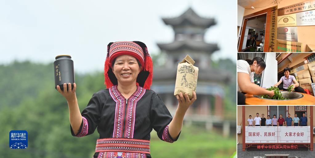 拼版照片:左圖為廣西梧州市蒼梧縣六堡鎮山坪村52歲的“70后”村黨支部書記、村委會主任祝雪蘭;右上、中圖為祝雪蘭在制茶;右下圖為祝雪蘭(左五)和同事們合影(2023年6月7日攝)。
