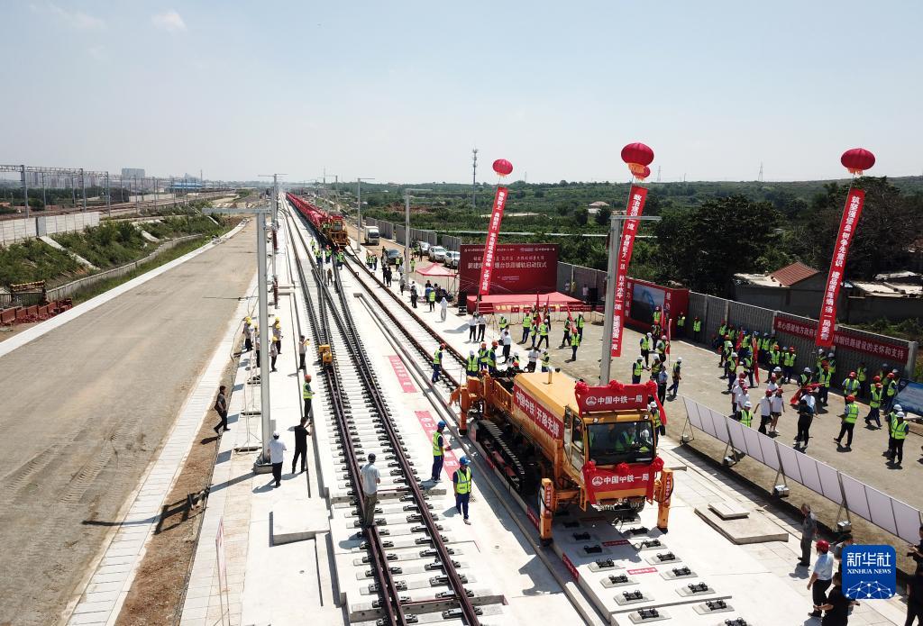 6月30日,在位于山東省煙臺市蓬萊區的濰煙高鐵施工現場,中鐵一局鋪軌機組施工人員在進行鋪軌作業(無人機照片)。