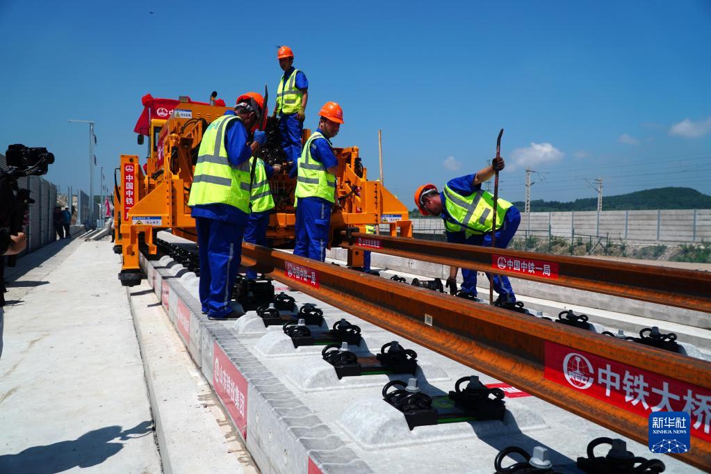 6月30日,在位于山東省煙臺市蓬萊區的濰煙高鐵施工現場,中鐵一局鋪軌機組施工人員在進行鋪軌作業。