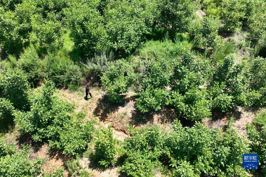 6月30日,賈志華在河北省臨城縣賈莊村查看核桃長勢(無人機照片)。