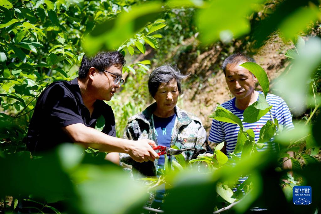 6月30日,賈志華(左)在河北省臨城縣賈莊村為農民講解核桃樹的夏季管理知識。