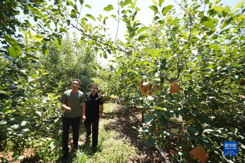 6月30日,賈志華(右)與隊員梁國軍查看蘋果長勢。