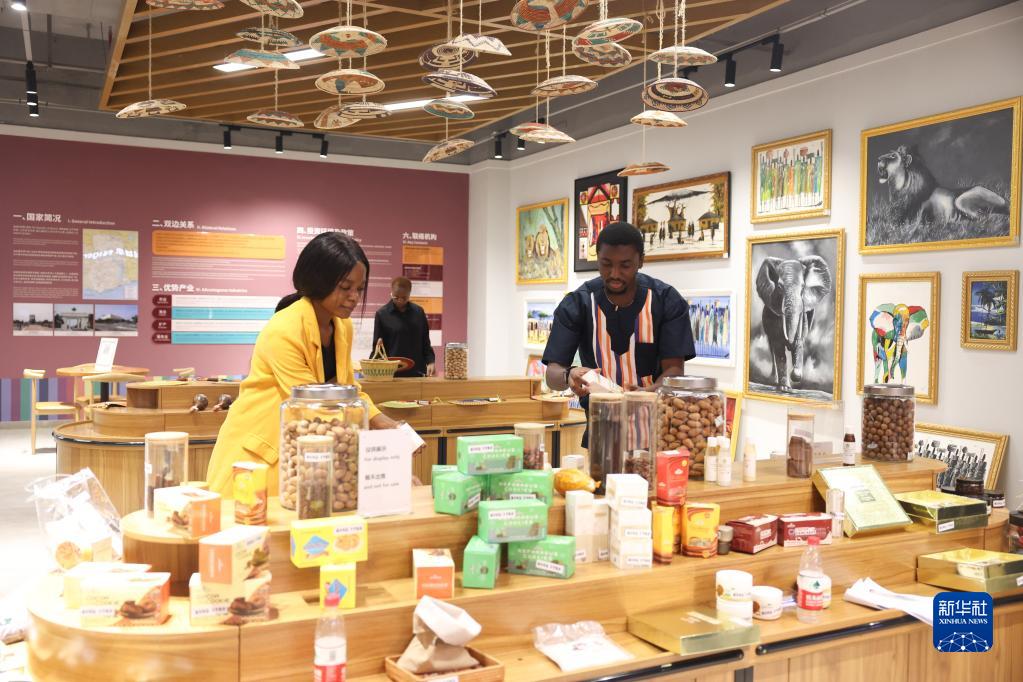 6月25日,在中非經貿合作促進創新示范園(湖南高橋大市場),來自贊比亞的志愿者卡賓(左)、來自剛果(金)的志愿者利法齊(中)和來自加納的志愿者高猛(右)在第三屆中非經貿博覽會開幕前布置展品。